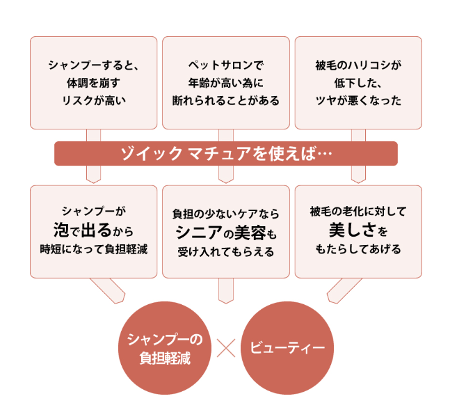 人は年齢や個性によって求める美しさ、肌ケア・髪質ケアが変わります。 ワンちゃんも年齢や個性によって美しさのポイント、ケアの方法は異なります。 『ゾイック マチュア シリーズ』はワンちゃんの年齢による皮膚や被毛の変化に合わせたケア、すなわちエイジングケアに着目しました。 シャンプー時のワンちゃんにあたえる負担を軽減しながらも美しく仕上がるので、大切なワンちゃんがさらに愛おしくなります。