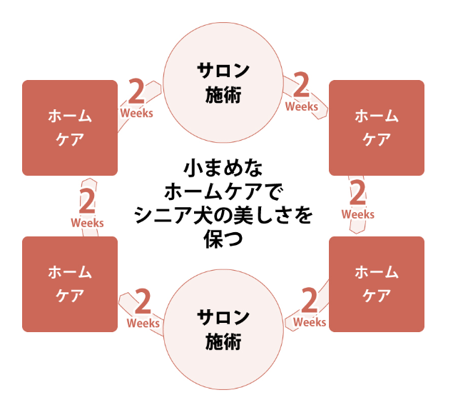 1.5ヶ月間隔のサロンケアのインターバルで、飼い主さまに2週間ごとのホームケアアイテムとして『ゾイック マチュア シリーズ』をご使用いただくことで常にキレイな状態をキープしていただけます。
