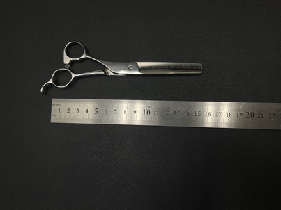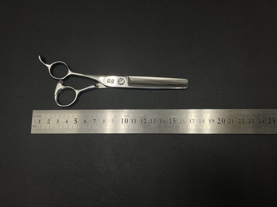 胡蝶(こちょう)とは、蝶の雅称。このブランドは伝統美シリーズとして、高級シザーが中心です。高い精度と耐久性を誇り、外観においても隅々まで気を配った加工、美しい磨き仕上げと、一級品です。最近では、カラー識別でカット率を表示したセニングシザー、本格仕上げ専用シザーなどを加え、ベテランの技術者のニーズにも応えています。RPシリーズの左バージョン。カット率55%の全身カット向けセニングシザー。カット後ラインが出る程度の仕上がりは作業効率が大変良く、サウスポートリマー待望の逸品です。