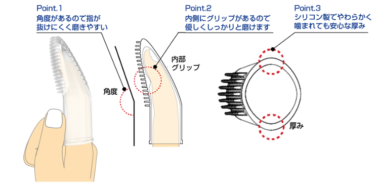 内側にグリップ部分がありますので、指から抜けることなく、しっかり磨けます。