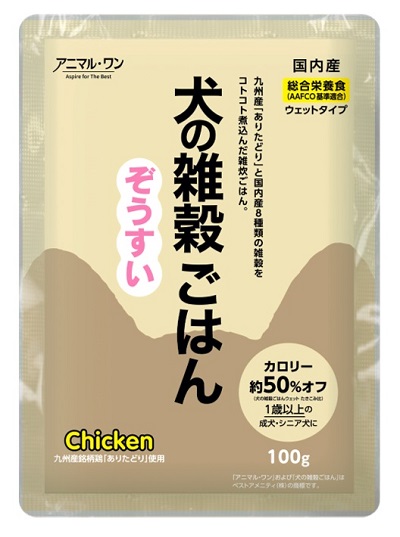 アニマル・ワンの「犬の雑穀ごはん」ウェットタイプは、国内産のお肉や雑穀をはじめとする厳選食材が主原料のドッグフード。栄養豊富な生命力あふれる雑穀の恵みを愛犬の食生活にも取り入れてほしい、そんな思いを込めながら九州の自社グループ工場で厳しい品質管理のもと、心を込めて製造しています。大切な家族が毎日食べるものだから、アニマル・ワンは飼い主さんが心から安心して与えられる愛犬の食事をお届けします。【九州有数の銘柄鶏「ありたどり」】ありたどりは「食肉産業展 地鶏・銘柄鶏食味コンテスト」で優秀賞を受賞したこともあるおいしい鶏肉。佐賀県・長崎県の契約農場で平飼い飼育、ケルプ(海草)の乳酸発酵エキスが添加された飼料を与えられるなど、肉質と味にこだわって育てられている九州有数の銘柄鶏です。【食品レベルの製造・品質管理】HACCP(食品の製造工程における品質管理システム)、有機 JAS 認証等の外部認証を取得しているグループの食品工場会社が運営管理する九州のペットフード工場で製造しています。※ペットフード工場での取得認証はありません【対象ライフステージ】1歳以上の成犬・シニア犬「たきこみ」に比べてカロリー約50%オフで、体重の気になる成犬、シニア犬に最適水分たっぷりでやわらかい雑炊タイプなので、歯の弱い愛犬にもおすすめ100g/ 袋 ・・・体重3kgの成犬の約 0.2日分(このフードのみ単体で与える場合)【給与方法】主食として本商品のみを与える場合は下記1日あたりの給与量目安を参考に、体質や体重、運動量、便の状態などを観察しながら量を加減し、1日2~4回に分けて与えてください。ドライフードに混ぜて本商品を与える場合は、適宜量を調整してください。