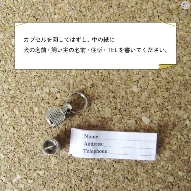 カプセルを回してはずし、中の紙に犬の名前・飼い主の名前・住所・TELを書いてください。