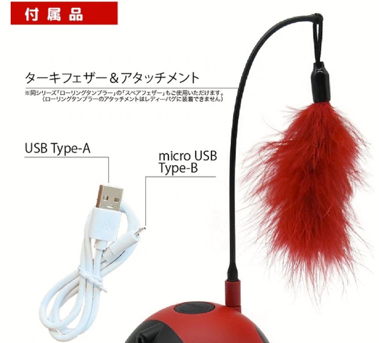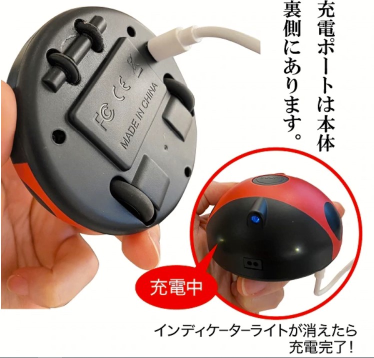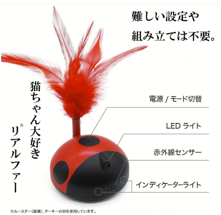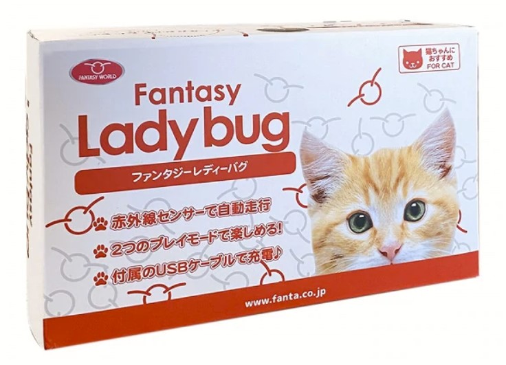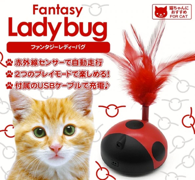 ストレス解消!運動不足解消に!自動で動く楽しいおもちゃ♪自動で動く楽しいおもちゃ♪遊びは猫ちゃんの狩猟本能を満たし、体の健康維持をサポートしてくれる大切な手段です。猫ちゃんのストレス解消!運動不足解消に!飽きずに遊んでくれます。・赤外線センサーで自動走行・2つのプレイモードで楽しめる!・付属のUSBケーブルで充電♪<サイズ> 9×9×16cm<重さ> 110g<材質> ABS・TPE、羽(雄鶏・ターキー)<生産国> 中国■操作方法■(1)ボタンを2秒ほど長押しすると電源が入り、プレイモード1になります。(2)もう一度ボタンを押すと、プレイモード2になります。*ボタンを押す度に「モード1」「モード2」をくりかえします。(3)ボタンを2秒ほど長押しすると電源が切れます。■2種類のプレイモード■・MODE:1:360°回転、自動走行・MODE:2:360°回転、自動走行、LEDライト点滅■インテリジェントモード搭載■本品は自動で動き回りますが1分ほど経過するとインディケーターライトを点滅させ動きが止まります。赤外線センサーが人やペットの動きを感知すると再び動きはじめます。万が一電源を切り忘れても2時間後には自動的に電源が切れます。(センサーに触れない場合)■充電方法■付属のUSBコードを充電ポートにさし込むとインディケーターライトが点灯し、充電をはじめます。(終了すると消えます)充電時間…約2時間作動時間…約1.5?10時間■バッテリー:リチウムポリマー(3.7V、600mAh)■ファンタジーレディーバグ用羽パーツもご用意しております。(別売)※注意※・本品はペット用です。子供のおもちゃではありません。・ペットのサイズや環境・性格に応じておもちゃを選んでください。・おもちゃを飲み込む恐れのあるペットには使用しないでください。・本品を分解しないでください。内部には小さい部品があるため、誤飲した場合窒息や腸閉塞など、重篤な危険を伴います。・本品は必ず飼い主の監視のもとで使用をおねがいします。・本品に強い衝撃を与えないでください。使用前には点検をし、破損している場合は交換してください。