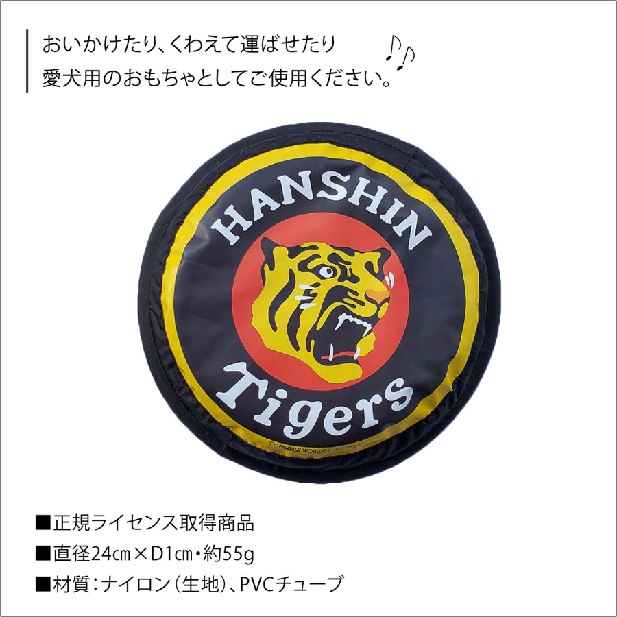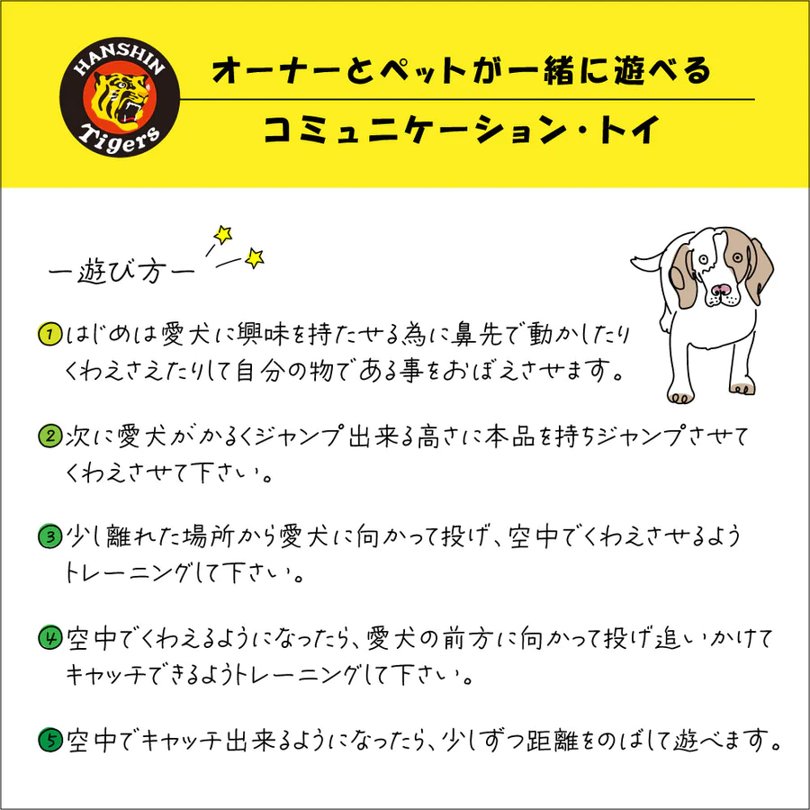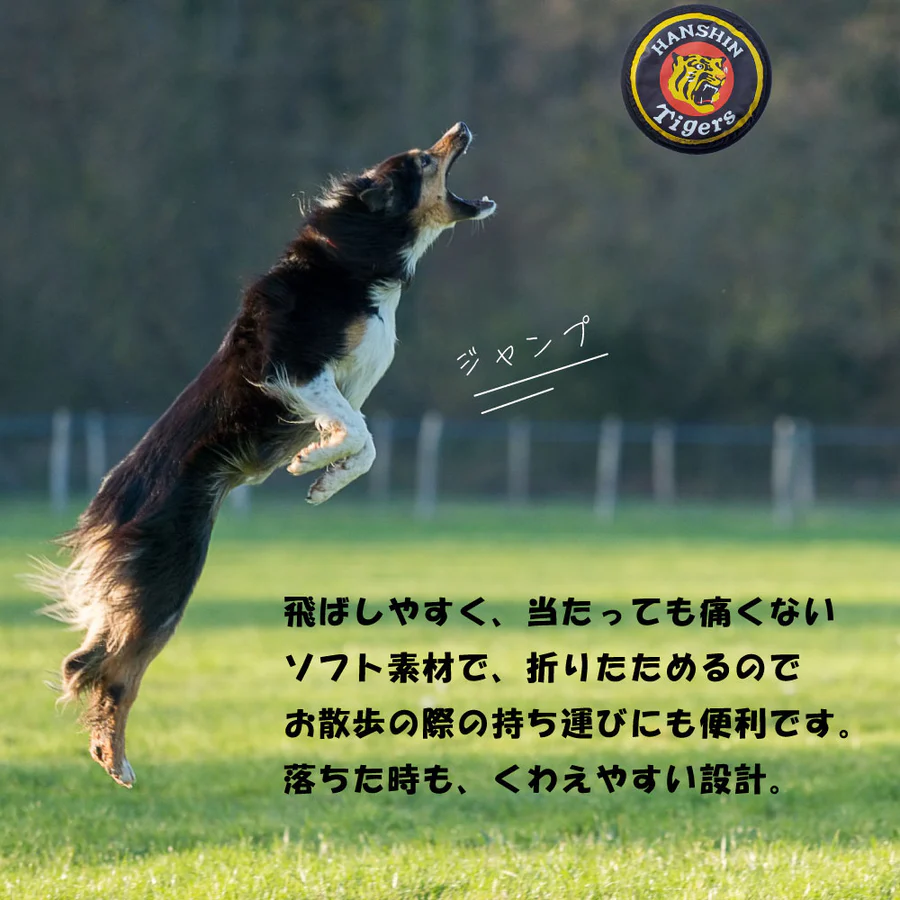 阪神タイガース球団承認のペットグッズがついに登場!! オーナーとペットが一緒に遊べるコミュニケーション・トイ。 おいかけたり、くわえて運ばせたり、愛犬用のおもちゃとしてご使用ください。 飛ばしやすく、当たっても痛くないソフト素材で、折りたためるのでお散歩の際の持ち運びにも便利です。 落ちた時も、くわえやすい設計。 飛ばして遊ぶ場合: ・はじめは愛犬に興味を持たせる為に鼻先で動かしたり、くわえさえたりして自分の物である事をおぼえさせます。 ・次に愛犬がかるくジャンプ出来る高さに本品を持ち、ジャンプさせてくわえさせて下さい。 ・少し離れた場所から愛犬に向かって投げ、空中でくわえさせるようトレーニングして下さい。 ・空中でくわえるようになったら、愛犬の前方に向かって投げ、追いかけてキャッチできるようトレーニングして下さい。 ・空中でキャッチ出来るようになったら、少しずつ距離をのばして遊べます。