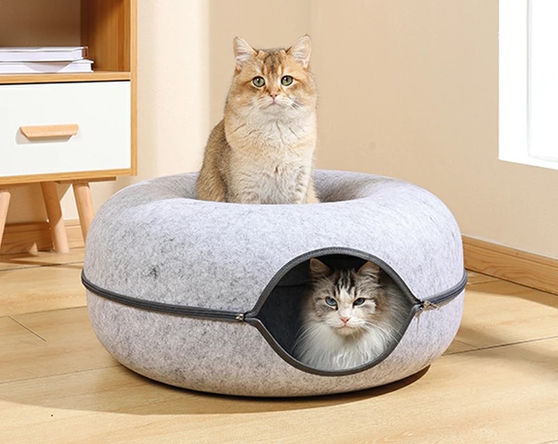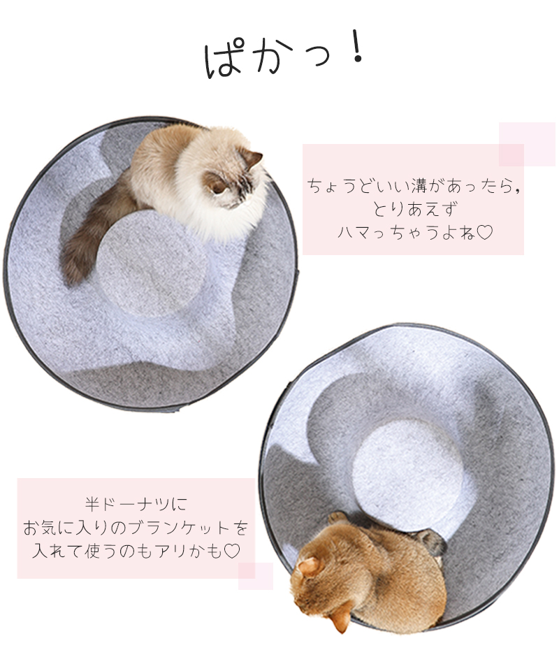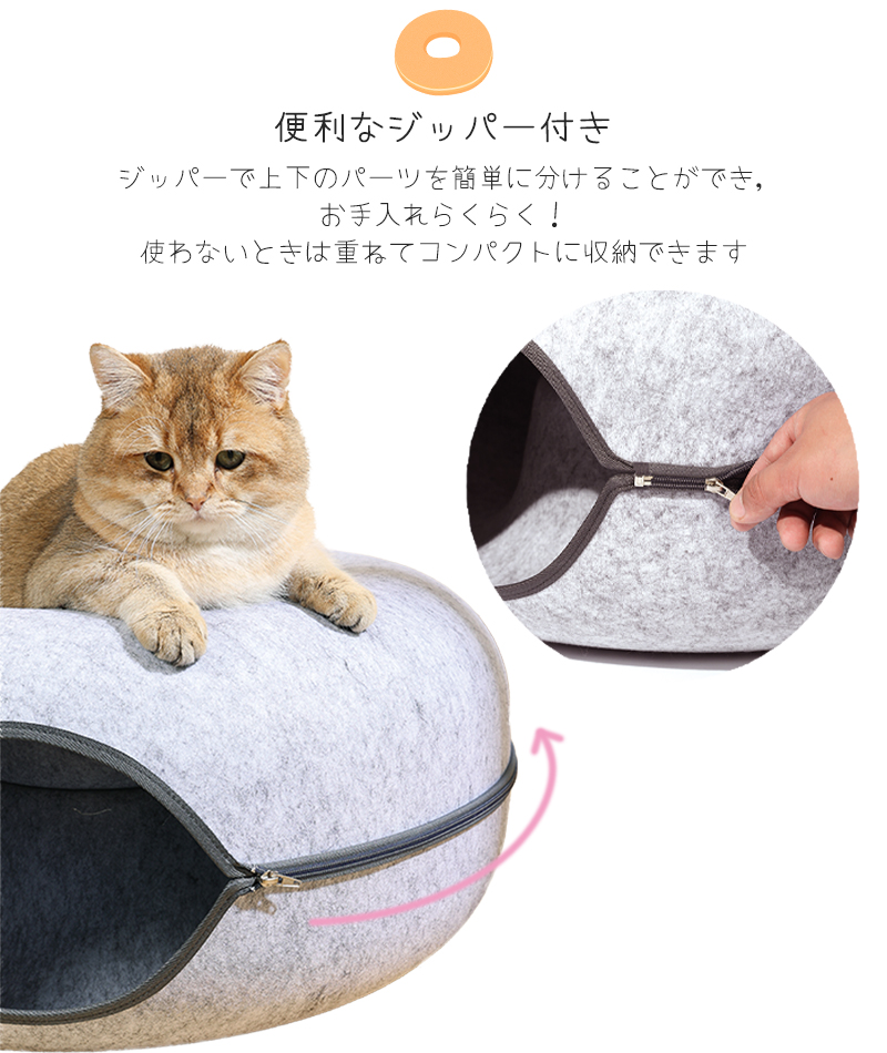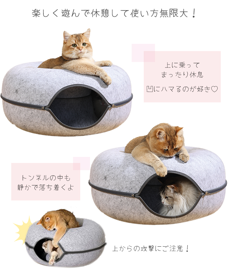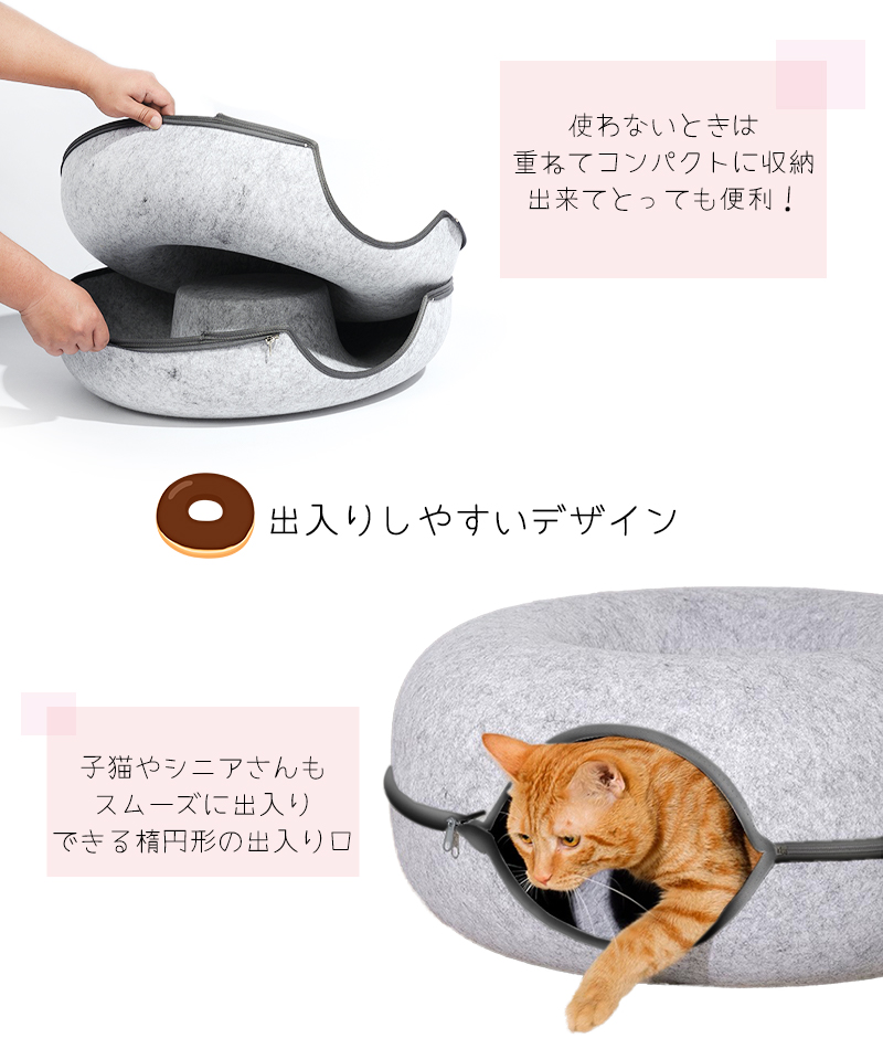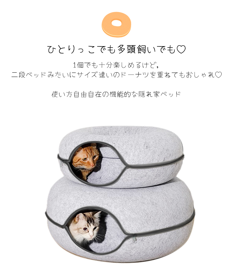 狭いところが大好きなネコちゃんにおすすめ!追いかけっこしたりかくれんぼしたりして、疲れたら一休みできる楽しいベッドです。トンネルの中で安心してくつろぐことができます。気分によってドーナツの上で寝ることもできます。サイズ違いで重ねてドーナツタワーにするとさらに楽しく遊ぶことができます。ジッパー付きでお手入れらくらく♪重ねてコンパクトに収納出来てとっても便利!モノトーンカラーのシンプルなデザインなのでお部屋のインテリアを邪魔することなくお使いいただけます。