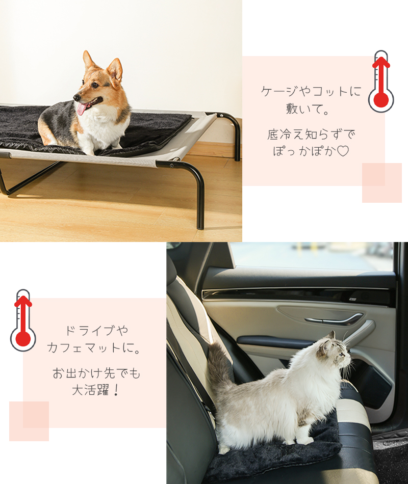 コンセントフリーだから安心!4層構造で熱を逃がさずしっかり暖かい!チャック付きでカバーを取り外して洗うことができるのでお手入れらくらく!いつものベッドに敷いてあげたり、コンパクトに持ち運べるのでカフェマットとしても使えてとっても便利!サイズ展開が幅広いので使い方によってお選びいただけます。なめらかで肌触りの良い毛足短めの高密度ファーが熱を逃がさずしっかり保温してくれます。コンセントフリーなのでいたずらしがちなパピーも安心してお使いいただけます。