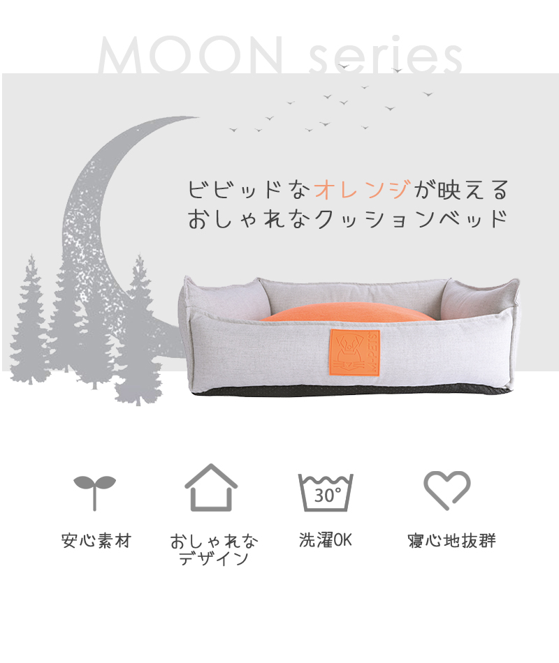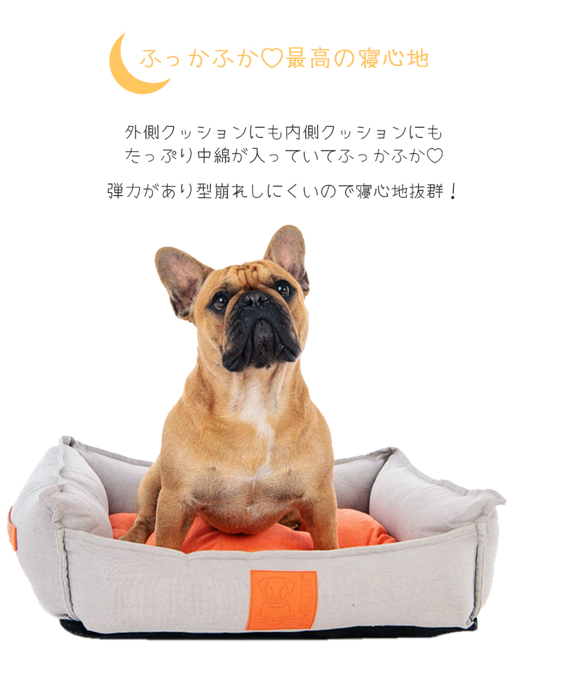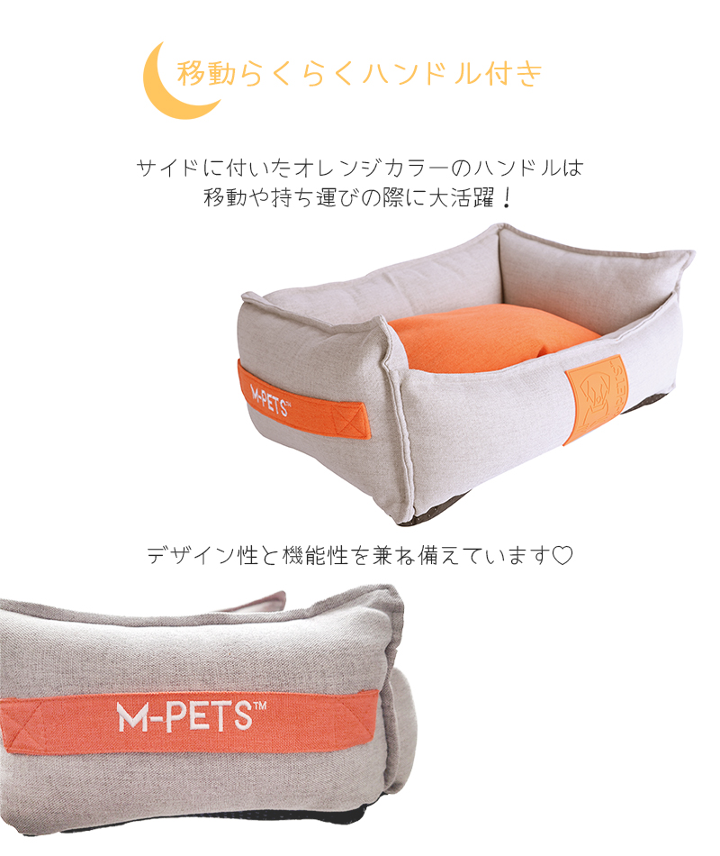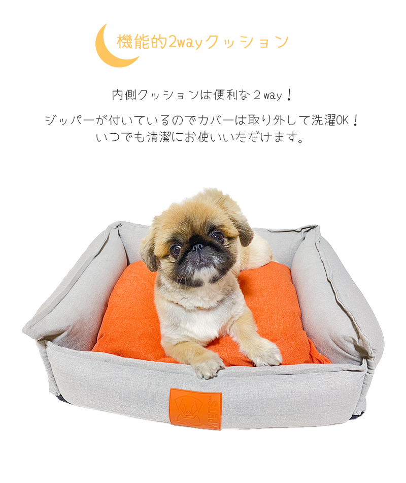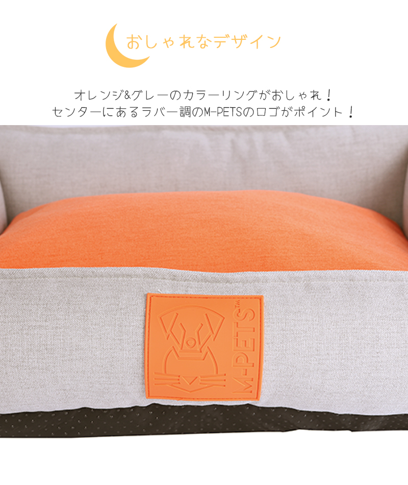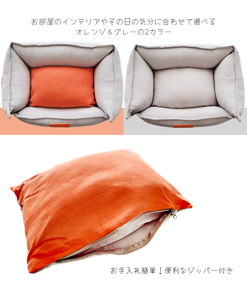 サイドに付いたオレンジカラーのハンドルは、ちょっとした移動に便利!デザイン性も高くポイントになっていてとってもおしゃれ!ラバー素材のロゴもPOPでかわいい☆中綿たっぷりの弾力のあるクッションは型崩れしにくく寝心地抜群!内側のクッションはグレー&オレンジの両面仕様になっていて、お部屋のインテリアや気分に合わせてカラーを変えることができます。ジッパー付きなのでカバーを取り外して洗濯することもできます。お手入れ簡単でいつでも清潔にお使いいただけます。