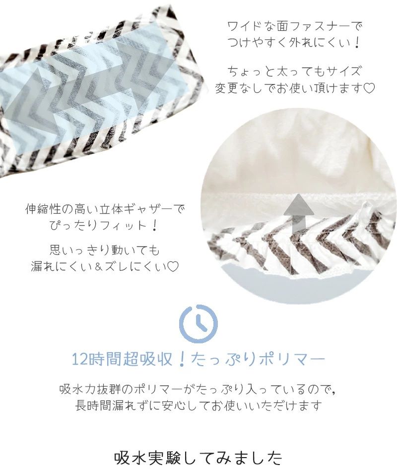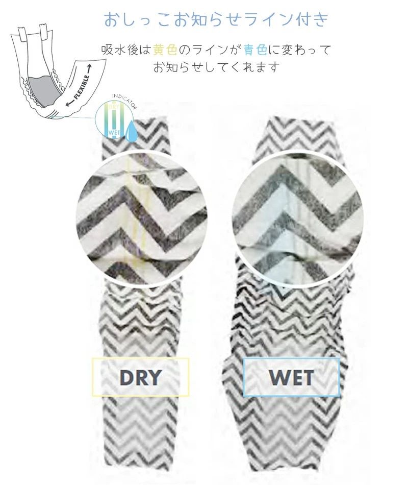 ◆北欧風シェブロンストライプ柄がとってもおしゃれで、つけてるだけでかわいい☆お洋服とのコーディネートも邪魔しません。◆おしっこすると黄色のラインが青色に変わる『おしっこお知らせライン』付き。◆サイズ調整しやすい設計で、ずれにくいので安心!◆通気性がよく、バツグンの12時間超吸収でおしっこ漏れの心配なし!◆前後の指定もないので装着しやすいです。◆サイドのギャザーを広げてから付けてあげるのがポイントです☆