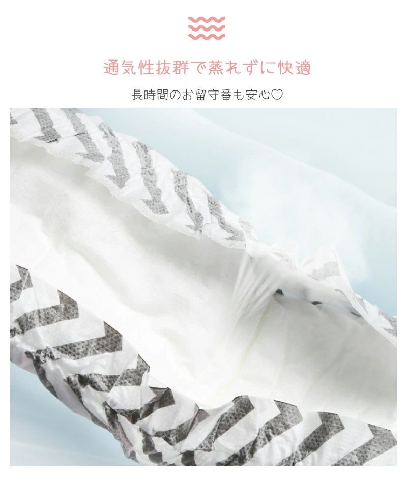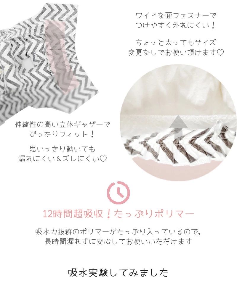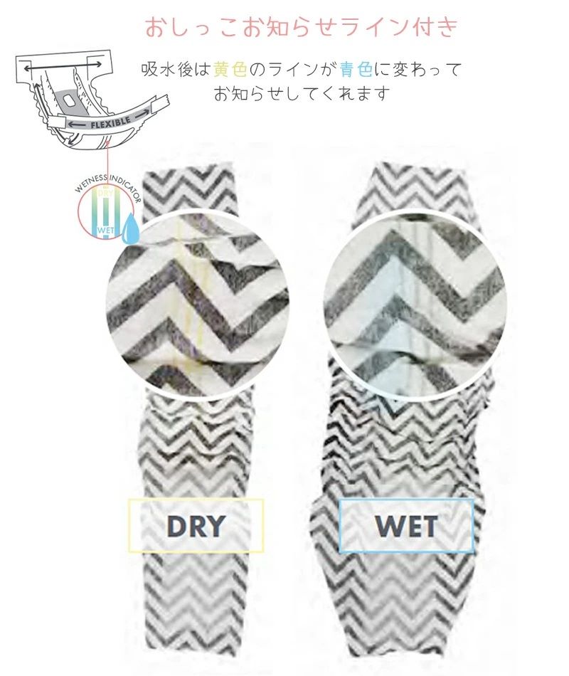 ◆北欧風シェブロンストライプ柄がとってもおしゃれで、つけてるだけでかわいい☆お洋服とのコーディネートも邪魔しません。◆おしっこすると黄色のラインが青色に変わる『おしっこお知らせライン』付き。◆通気性がよく、バツグンの12時間超吸収でおしっこ漏れの心配なし!◆サイドのギャザーを広げてから付けてあげるのがポイントです☆