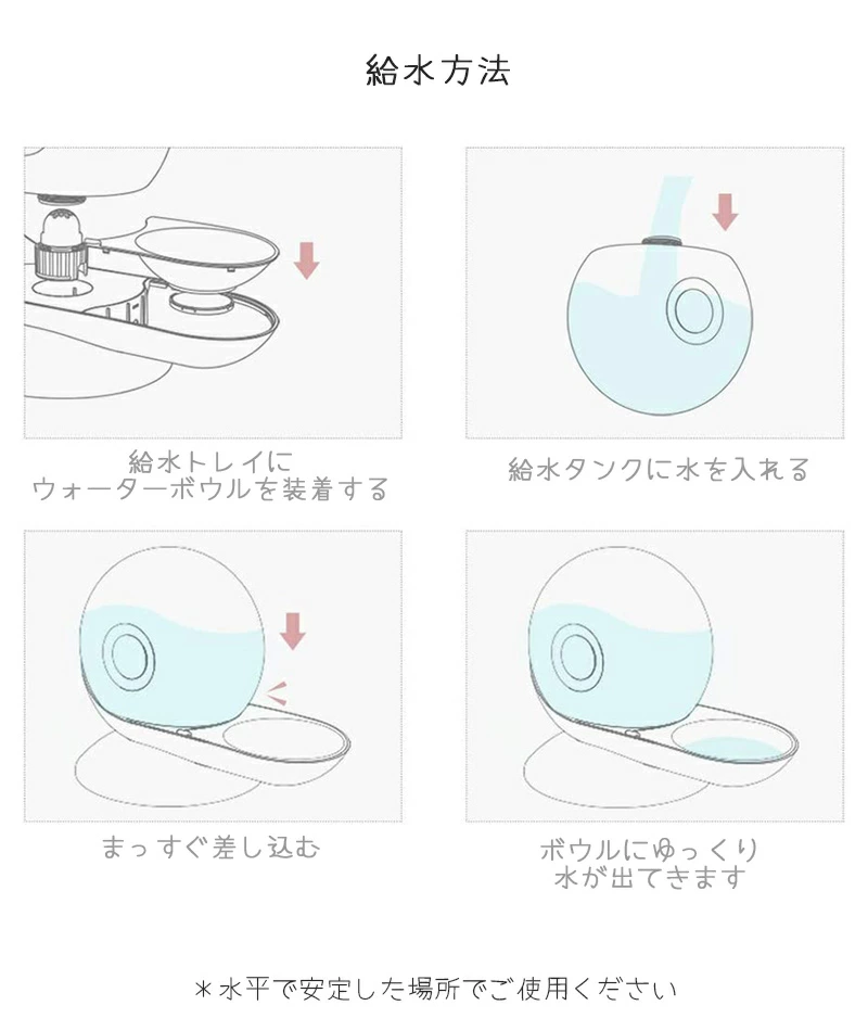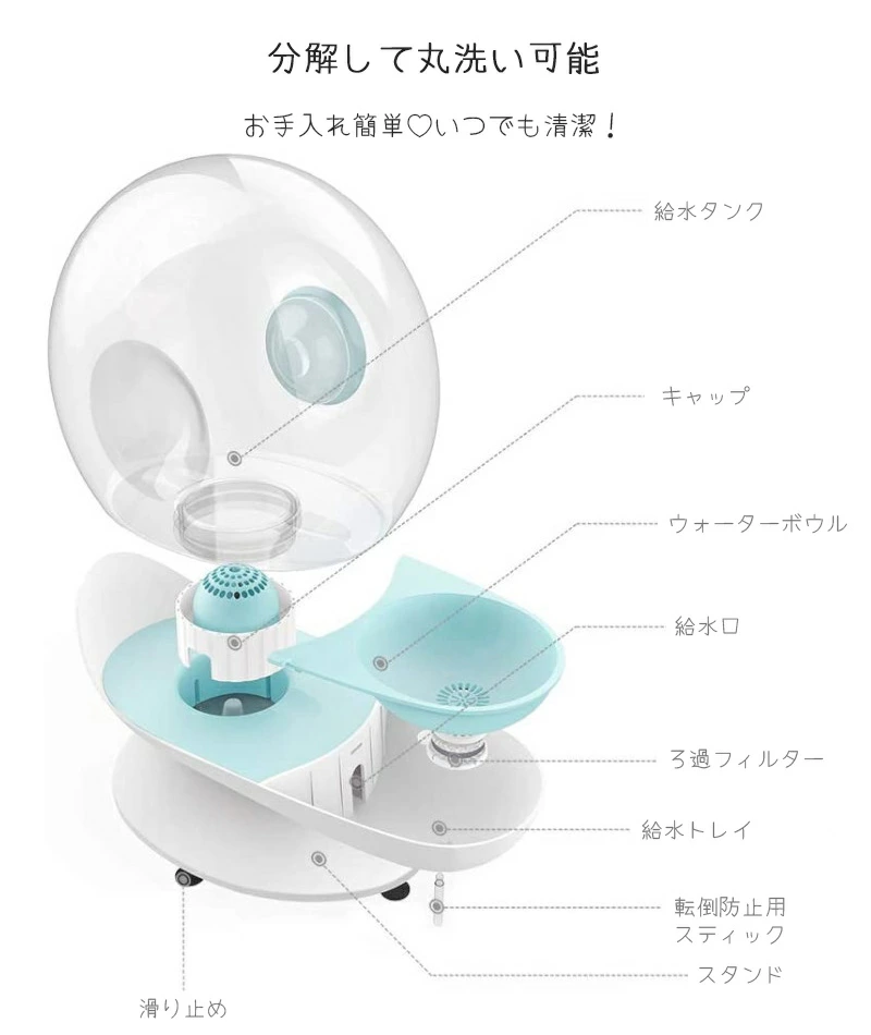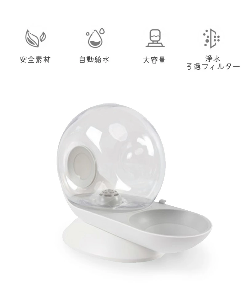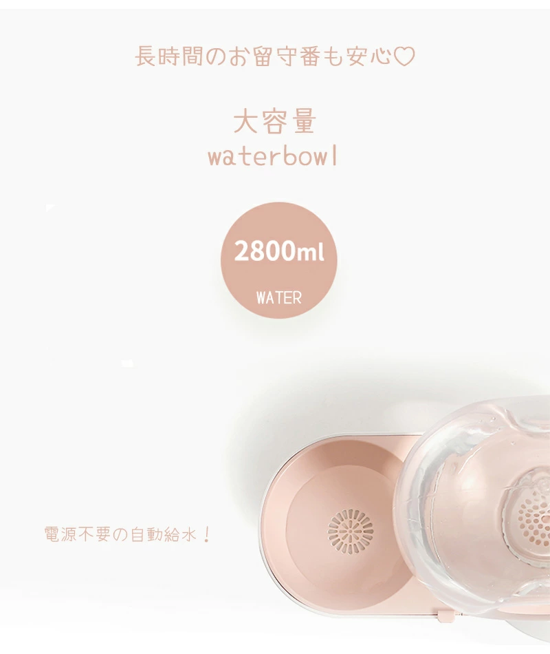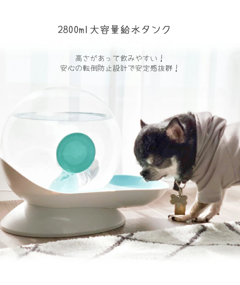 2.8Lの大容量デザインのため、小型犬や猫1匹の約7~15日間の必要な水分を、 1度の水補充で用意できます。長時間のお留守番も安心! 重力を利用した給水設計のため、電気系製品のモーター音によるストレスを解消することができ、 ベッド付近や、小空間での設置でも騒音のご心配が必要ありません。 高さがあって飲みやすく、安心の転倒防止設計で安定感抜群!
