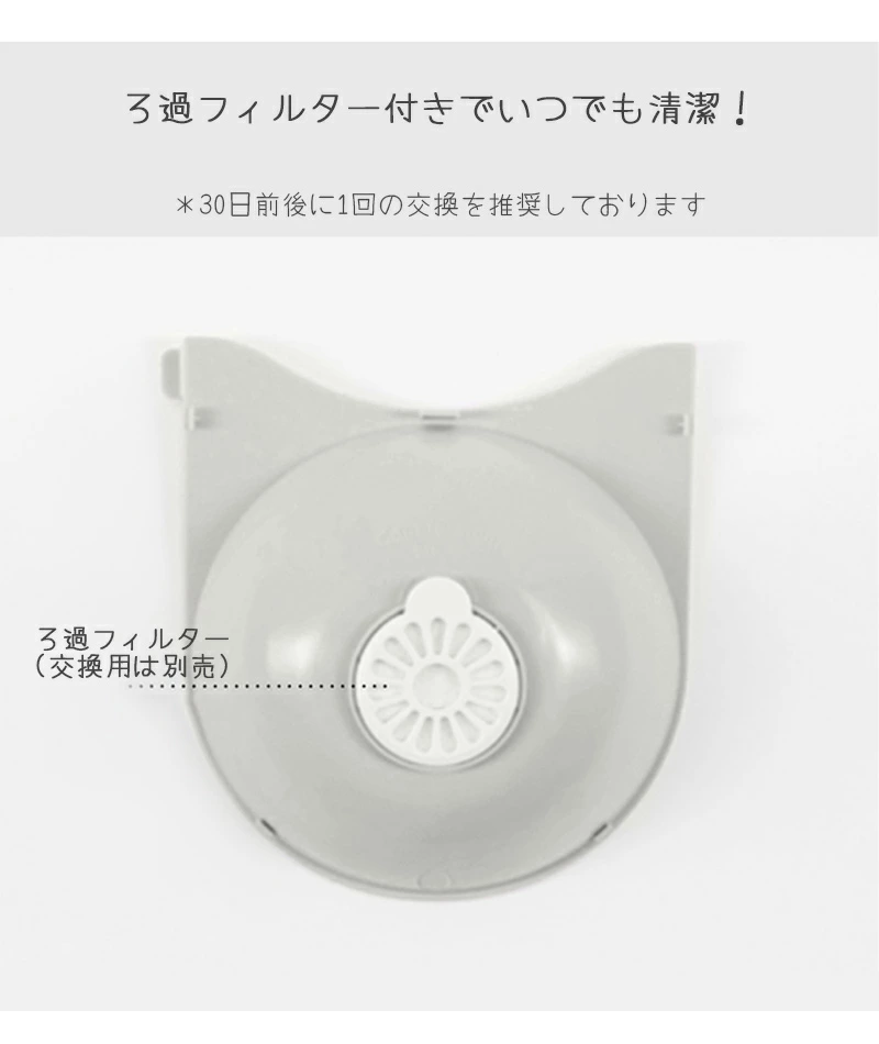 ろ過フィルター付きでいつでも清潔 ※30日前後に1回の交換を推奨しております。 交換用は別売りです。