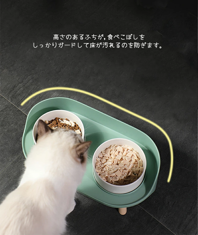 高さのある台には縁があり、食べこぼしたフードや水が床に落ちにくい設計になっています。