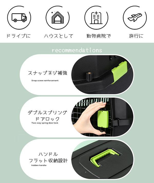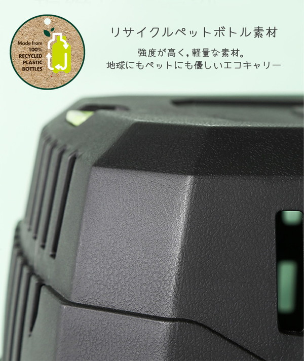 IATA規格クリア!安全性・機能性の高いECO素材ハードキャリー。 ■軽くて丈夫なリサイクルプラスチック素材! ■水洗いできるので、いつでも清潔に使えます。 ■IATA規格クリア。飛行機OK! XS・S・Mサイズはハンドルのみ。 L・XL・XXLサイズはキャスター付き。