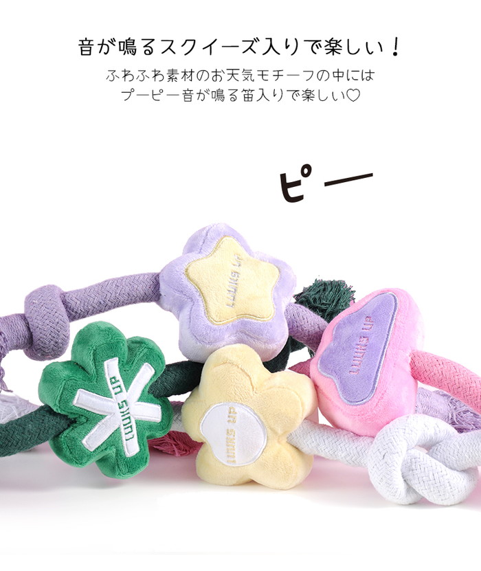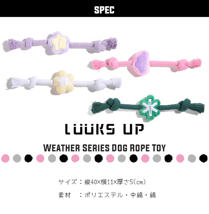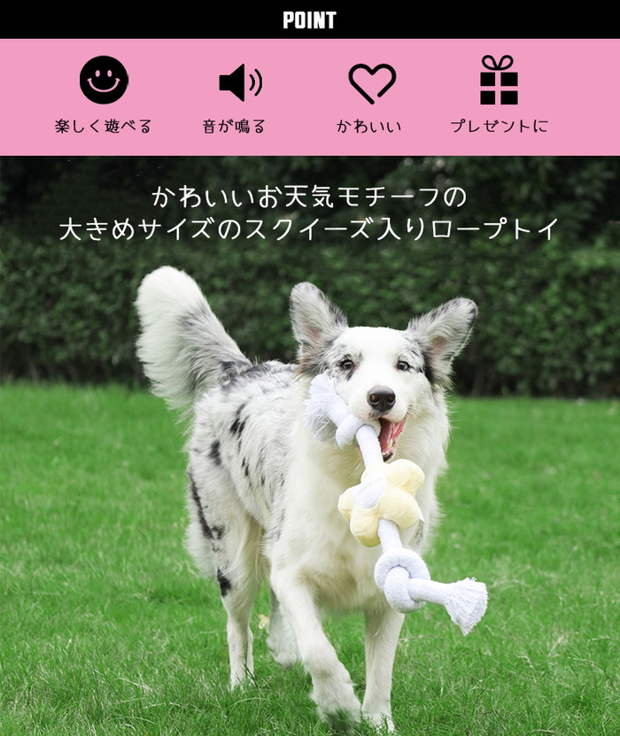 お天気モチーフからデザインされたカラフルでかわいいロープトイ。 ロープは直径約2cmと太く丈夫! 小型犬から中型犬にピッタリのサイズになっています。