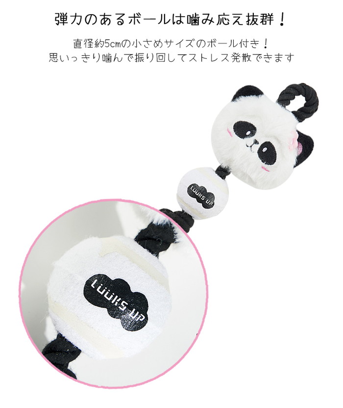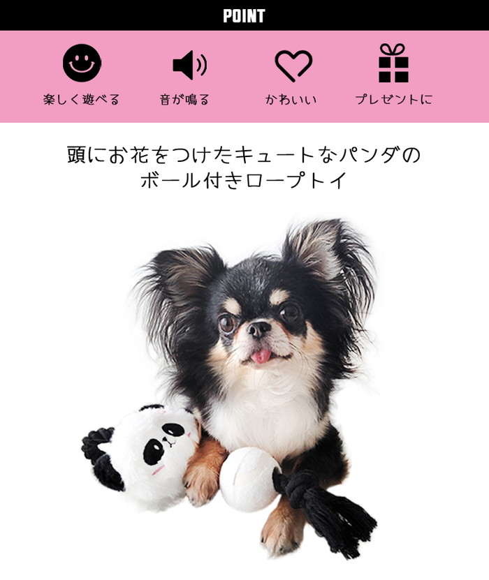 頭にお花の飾りを付けたキュートなパンダのボール付きロープトイ。 ロープは直径約1cmと、子犬や小型犬にピッタリのサイズになっています。
