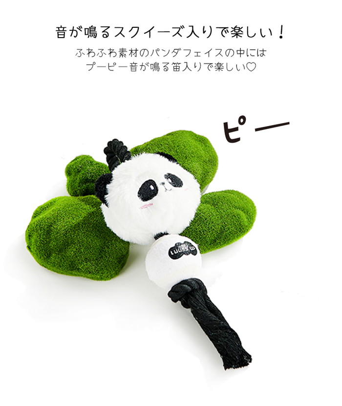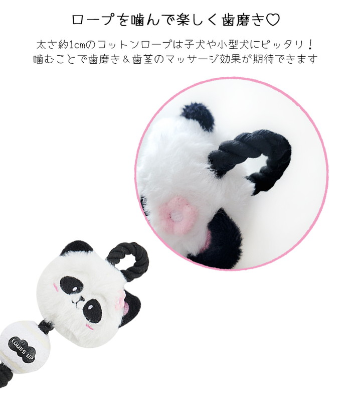 ふわふわキュートなパンダフェイスの中に、プープー音が鳴るスクイーズが入っています。 音を鳴らしたり、引っ張ったり、振り回したりと、楽しく遊べるかわいくて丈夫なロープトイです。 ロープ部分をガジガジ噛むことで歯磨き効果も期待できます。