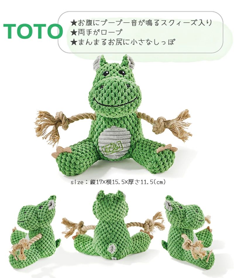 リサイクル素材で作られた環境に優しいかわいいおもちゃです。振り回して遊んだり、プー!ピー!音を鳴らして楽しく遊べます♪ロープ部分を噛むことでストレス発散&歯磨き効果も期待できます。プープー音が鳴る笛が真ん中に入っているので、わんちゃんが夢中になること間違いなし!モモンガとウサギはカシャカシャセロファン入り!