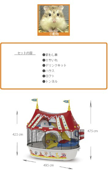 ■サイズ W 49.5 H 42.5(旗含まず) cm■セット内容 ケージ本体、まわし車、エサいれ、ドリンクキット、ハウス、ロフト、トンネル