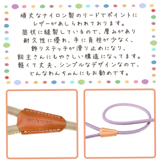 イタリアferplast社製の犬用リード。頑丈なナイロン製のリードでポイントにレザーがあしらわれております。筒状に縫製しているので、厚みがあり耐久性に優れ、手に負担が少なく、飾りステッチが滑り止めになり、飼主さんにもやさしい構造になってます。軽くて丈夫、シンプルなデザインなので、どんなわんちゃんにもお勧めです。※イタリアのメーカーより商品の仕様、セット内容など変更が頻繁にありますので、商品写真と異なる場合がありますがご了承ください。