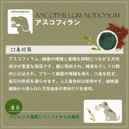 【アスコフィラン】は、細菌の増殖と蓄積を制限につながる天然成分が豊富な海藻です。腸に吸収され、唾液を介して口腔内に分泌され、プラーク細菌の増殖を抑え、口臭を防ぎ、歯石の形成を遅らせます。人工着色料は不使用、植物から得られる天然由来の素材だけを使用:スピルリナ藻類とベニバナからの緑色。