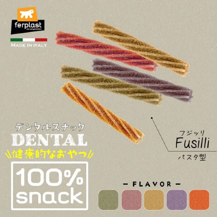 犬用のデンタルスナックは、ご褒美を与えると同時に犬の口腔衛生を促進することを目的としています。ferplastの100%スナックは、革新的な形状と有用な機能性成分のおかげで、あらゆるニーズを満たすように設計された犬用のベジタリアンデンタルスナックです。100%ナチュラルで健康的な愛犬用のベジタリアンスナックは、噛むことにより口内環境の健康を維持します。歯垢を除去するのに効果的であり、また歯茎にマッサージ効果をもたらします。人工着色料は不使用、植物から得られる天然由来の素材だけを使用しています。