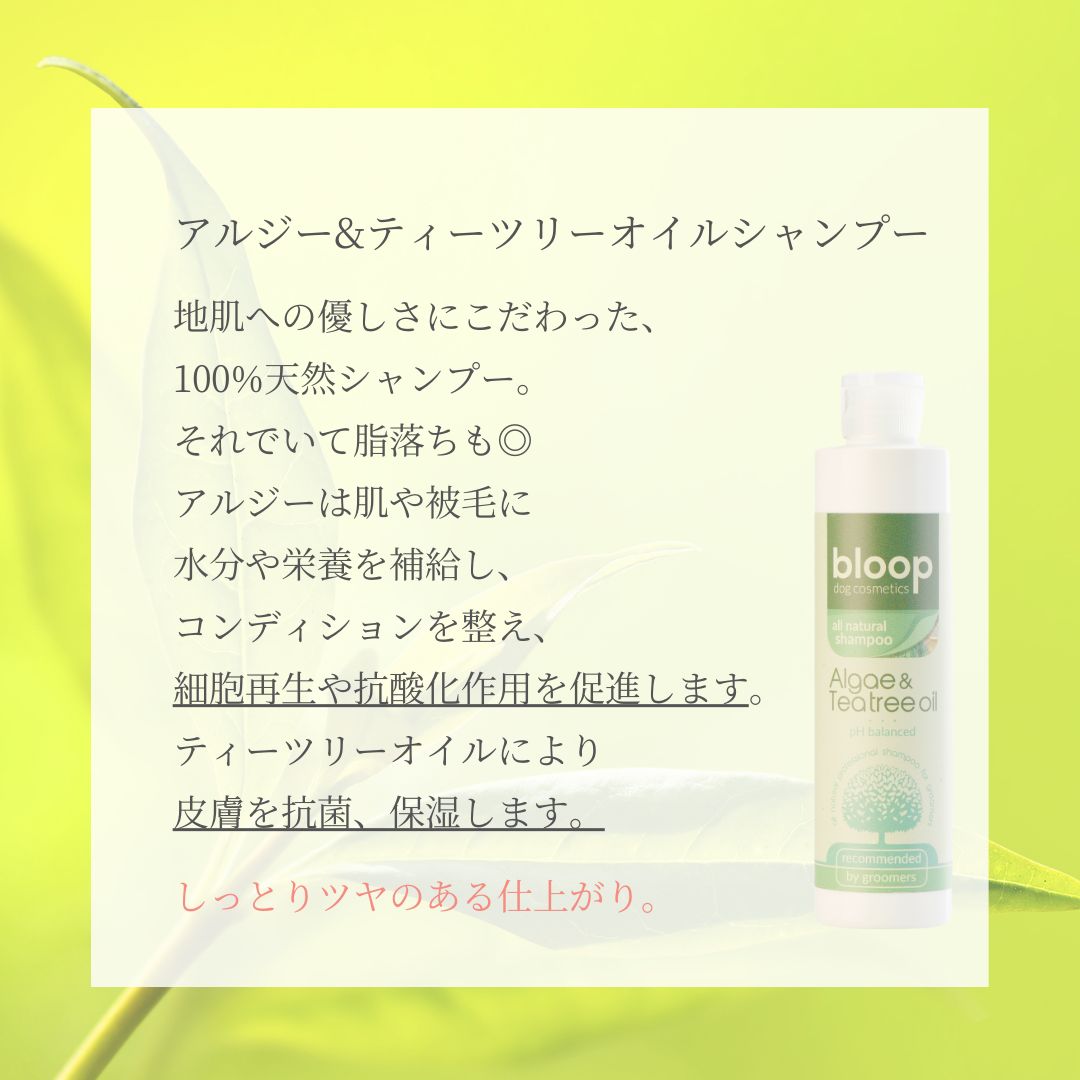 アルジーが肌や被毛に栄養を与え、細胞再生や抗酸化作用を促進、ティーツリーオイルで抗菌、保湿し、しっとり艶のある仕上がりに。