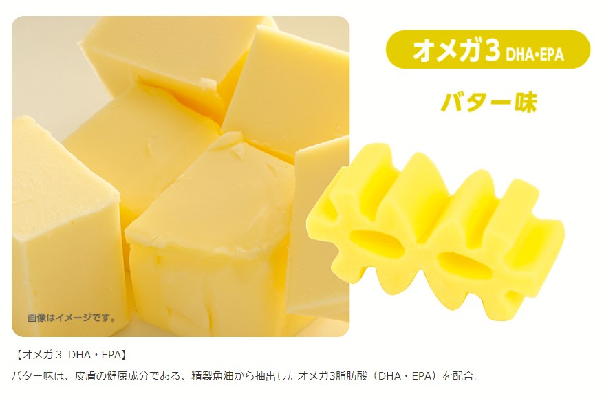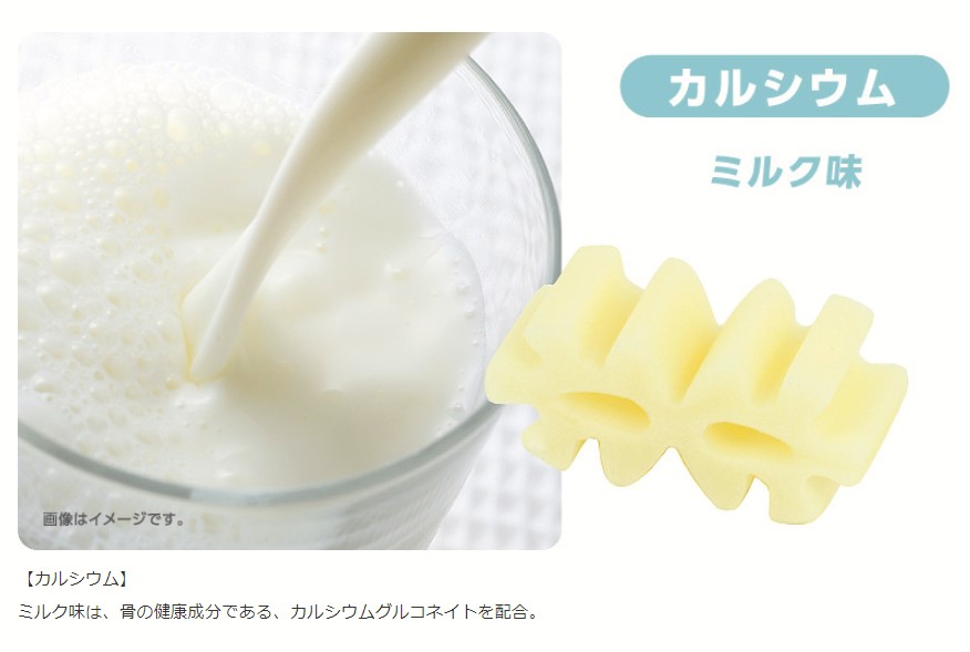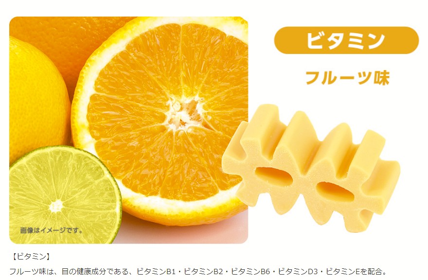 【与え方】愛犬の体重に適したサイズを、1日に朝と夜1個ずつ与えてください。愛犬の健康状態、便の状態、運動量、季節によって給与量を加減して、食べ過ぎないようにしてください。【成分表示】 粗たん白質 5.0%以上 粗脂肪 3.0%以上 粗繊維 2.0%以下 粗灰分 2.0%以下 水分 14.0%以下 カロリー 約4.2kcal/g【原材料】 ビタミン フルーツ味コンスターチ、ライスパウダー、マルチトール、イソマルトオリゴ糖、グリセリン、豚ゼラチン、乳化剤、ビタミン類(B1,B2,B6,D3,E)、香料、パプリカ色素【原材料】 カルシウム ミルク味コンスターチ、ライスパウダー、マルチトール、イソマルトオリゴ糖、グリセリン、豚ゼラチン、乳化剤、グルコン酸カルシウム、香料【原材料】 オメガ3 バター味コンスターチ、ライスパウダー、マルチトール、イソマルトオリゴ糖、グリセリン、豚ゼラチン、乳化剤、キャノーラ油、フィッシュオイル、香料、クチナシ色素