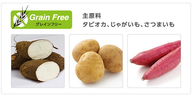 「タピオカ、じゃがいも、さつまいも」などの澱粉類を使ったグレインフリー(穀物不使用)商品です