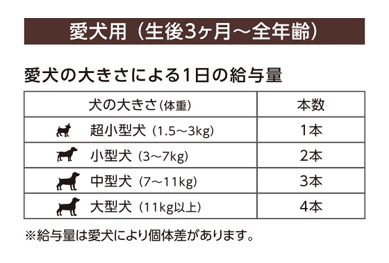 1日の給与量を目安にお与えください。愛犬の健康状態、腸の状態、運動量、季節に応じて量を調節し、食べ過ぎないようにしてください。