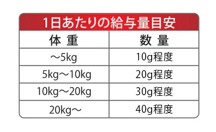 ・給与量目安を参考に必ず飼い主様の目の届く範囲で、主食の補助食もしくはおやつとして与えてください。