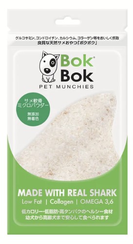 BokBok(ボクボク)は、インド太平洋熱帯・亜熱帯域全域の沿岸に広く生息する「blacktip shark(日本名:ツマグロ)」というサメ種を主原材料に使用した、タイランド産の犬用サメおやつです。