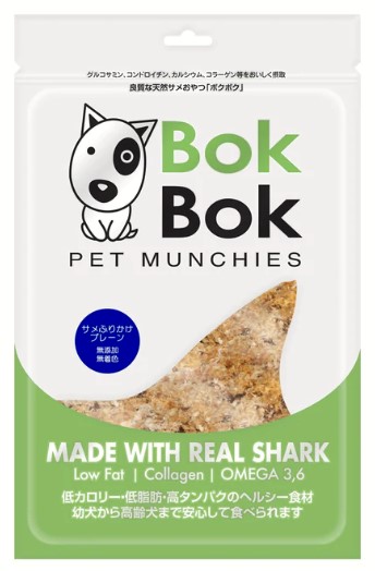 BokBok(ボクボク)は、インド太平洋熱帯・亜熱帯域全域の沿岸に広く生息する「blacktip shark(日本名:ツマグロ)」というサメ種を主原材料に使用した、タイランド産の犬用サメおやつです。