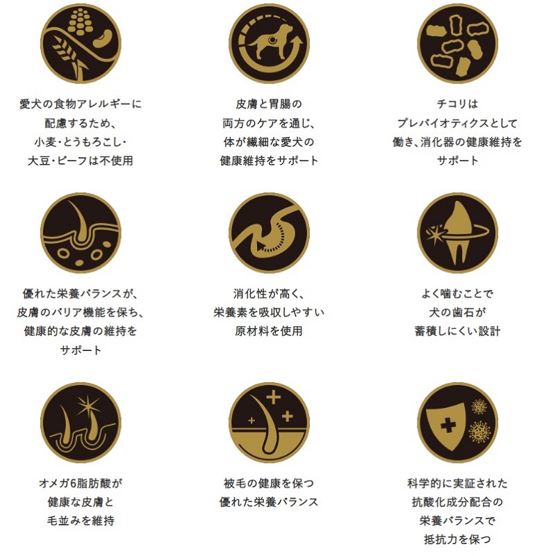 皮膚と消化の健康維持のため、愛犬の食物アレルギーに配慮した科学的に実証された設計。 繊細な皮膚と胃腸に考慮して、サーモンとあじを主原料に、小麦、とうもろこし、大豆、ビーフは不使用。 皮膚と胃腸の両方をケアすることで、体が繊細な愛犬の健康維持をサポート。 合成着色料・香料 無添加。 ※製造上、形状や大きさにバラつきが生じることがあります。