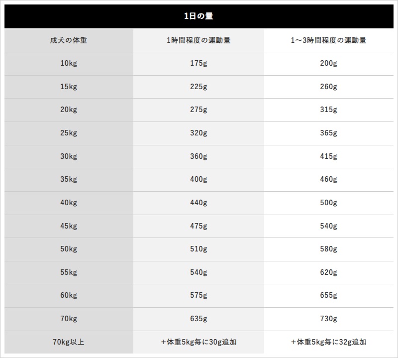 ・適切な体型を維持するために必要な量は、代謝量、犬種、体重、運動量、年齢や避妊・去勢の有無などによって異なります。