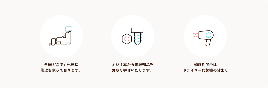 ※ドライヤー代替機の貸出しは、当店にてお買い上げいただきましたお客様に限ります。(貸し出し機には数量に限りがございます)